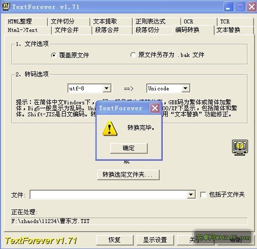打開TextForever並按照紅框所選選擇,先把UTF-8轉換成UNicode.選擇咱們剛才用妖眼轉出來的TXT.