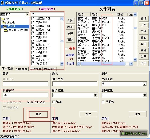 最後再次打開妖眼工具,注意[代替字符]裡咱們寫上VCF,就是最終需要的聯系人文件了!