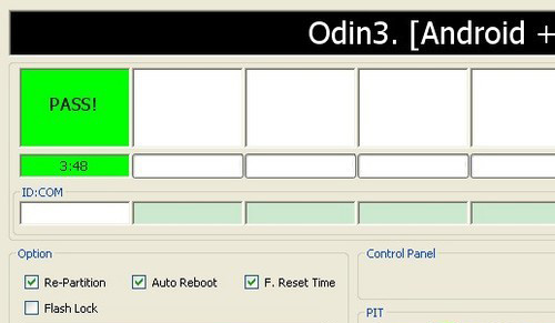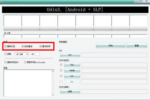 在電腦上打開三星刷機工具Odin,勾選重新分區、自動重啟、重設時間這幾個選項。