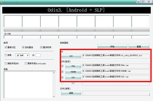 點擊Odin上的PIT選擇電腦上的PIT文件、PDA文件、PHONE文件和CSC文件。