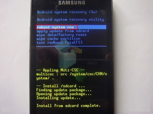 雙wipe完成後,在recovery界面用音量鍵選擇到第一項,也就是reboot system now(重啟系統),然後等待手機重啟。