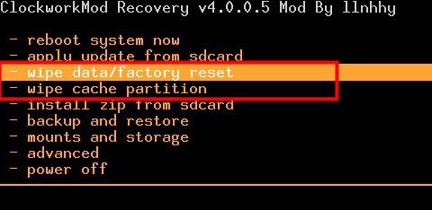 進入recovery模式後,屏幕上會出現幾個選項菜單,其中“wipe data/factory reset(清除數據/恢復出廠設置)”和“wipe cache partition(清除緩存)”是我們需要的。