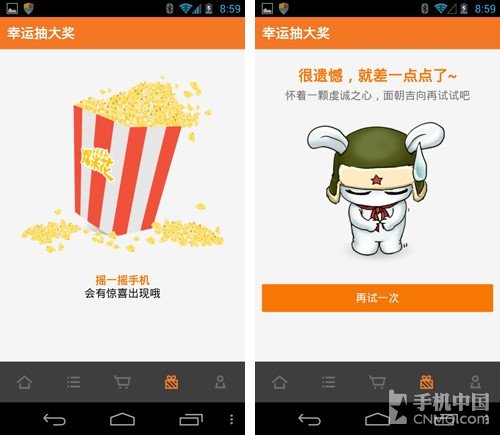 小米商城目前的版本制作非常簡單,僅有主頁、分類、登陸等幾項簡單功能,除此之外,小米商城還提供了幸運抽大獎功能,搖一搖手機說不定就能中獎。不過筆者的手氣實在太差,反復挑戰最後還是空手而歸。