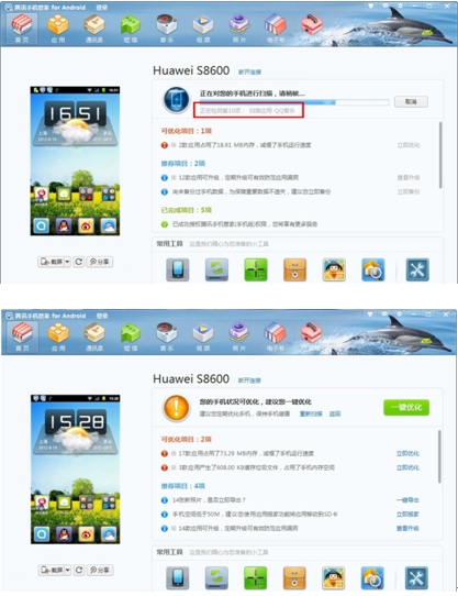 選擇“一鍵優化”後,騰訊手機管家PC版將快速、准確、高效的完成手機優化處理,讓您的手機保持良好的健康狀態,時刻擁有最強動力。