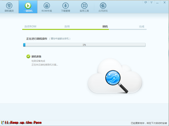 然後點擊一鍵刷機,其中你可以選擇勾選或者不勾選清除數據或者備份。進入自動刷機狀態,首先的過程是推送Rom到內存卡(所以請確保你的機子已經放置內存卡並且有足夠的剩余空間)
