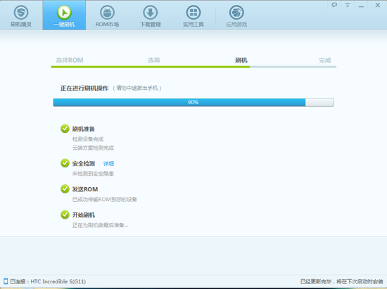 發送Rom完畢之後就是完全的手機上的過程了,這時斷開數據線也不會有影響的,你可以在手機上看到刷的過程,刷完之後也會自動重啟手機的。
