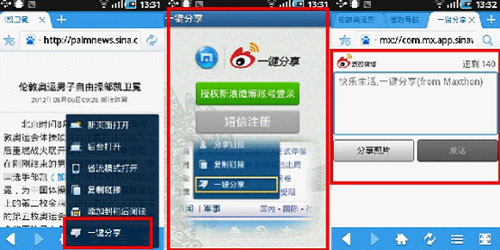 社交網絡時代,微博已成為了當下表達感情和態度的社交平台。新浪微博作為傲游浏覽器Android手機版應用擴展平台上的亮點功能,用戶只需通過網頁中的長按菜單“一鍵分享”,便可直達微博,分享你的觀賽心情。讓你上網觀賽、微博分享兩不誤。