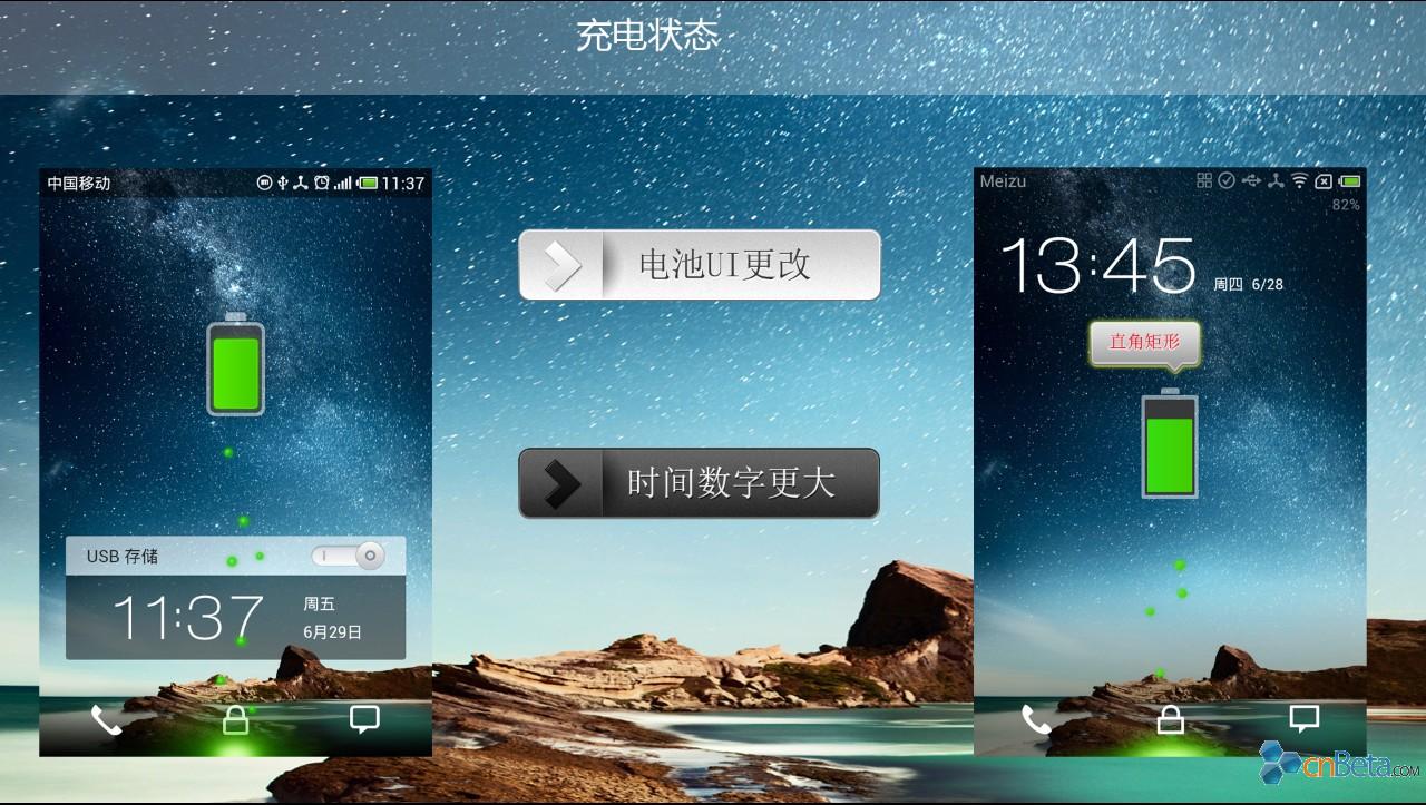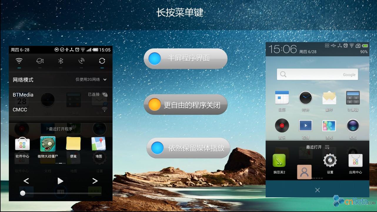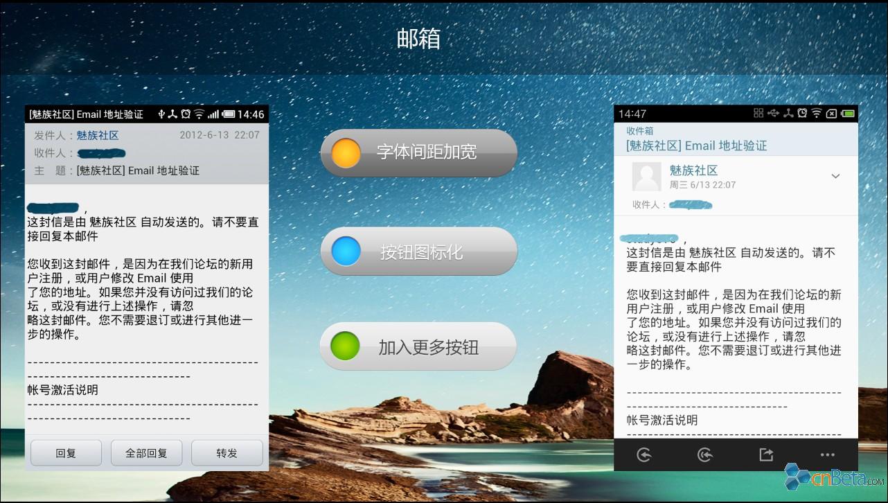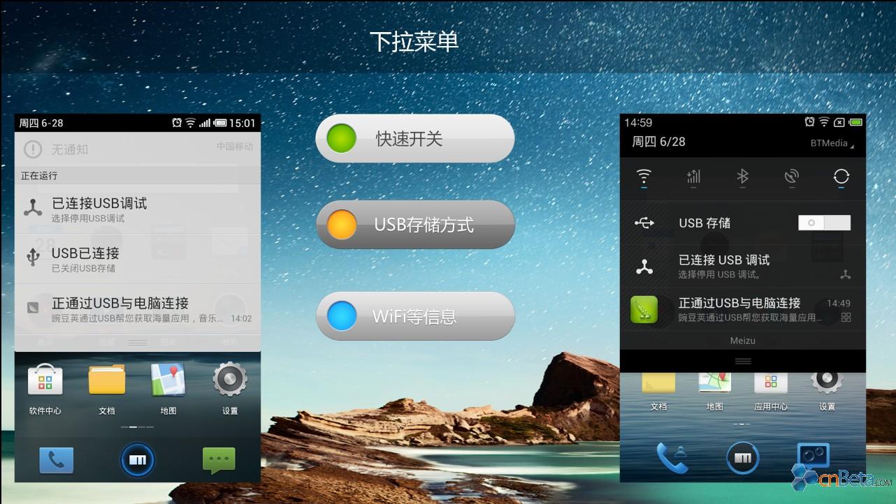 Flyme OS 1.0為基於Android4.0由魅族深度優化的系統,在界面和內容上均有所改變,在提供強悍的硬件的同時優化系統和軟件的運行速度和顯示效果,強調個性化的手機。(左圖為舊系統,右圖為Flyme,下同)