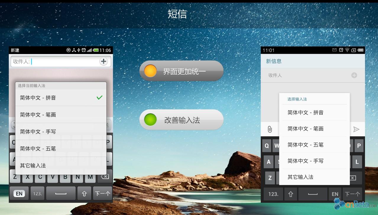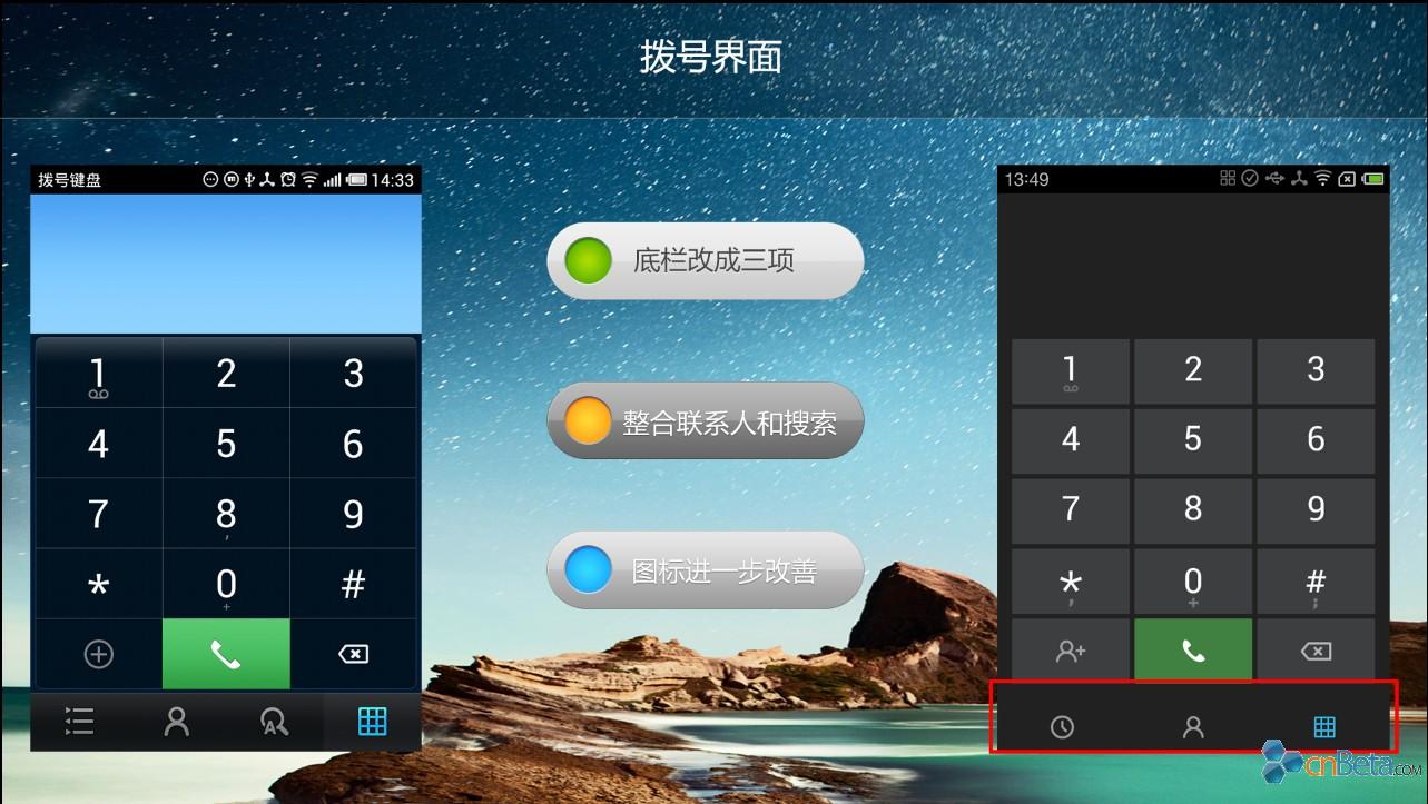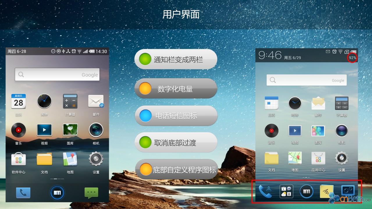 新的系統允許在底部程序欄添加最多四個程序圖標,默認狀態下只有電話和短信兩個快捷方式,並且圖標的樣式也經過了重新設計。