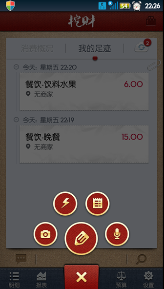 首頁的記賬采用“風火輪”式UI,擁有包括拍照、語音、票據上傳、模板記賬、普通記賬等六種記賬模式。