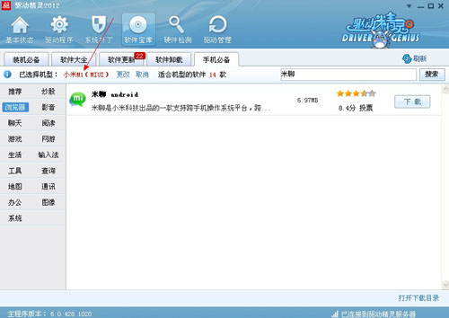 首先打開驅動精靈,點擊軟件寶庫,然後找到手機必備這個選項,點擊進入後在選擇機型的欄目中選擇小米手機,驅動精靈已經為了你羅列了,小米手機的一些裝機必備軟件,諸如如閱讀、輸入法、地圖、辦公等軟件。