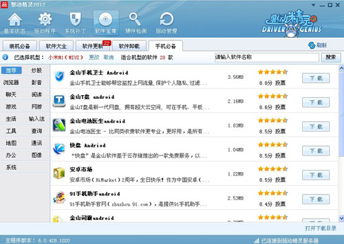 第一天的新鮮勁還沒過,手機提示電量不足,索性直接將小米手機插到電腦上充電時,正在運行的驅動精靈主動彈出提示,為小米手機安裝了相應的驅動。我隨手打開驅動精靈浏覽,卻意外發現它的軟件寶庫中還提供智能手機裝機必備的軟件。