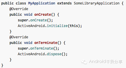 有兩種方式,一種是配置AndroidManifest的application的name屬性,同時在meta-data標簽中可選的配置db的name和version;二是在自己的Application類中繼承ActiveAndroid的Application;前兩種方式入侵性太強,還有一種只需在自定義的Application中靜態的注入兩個方法即可。