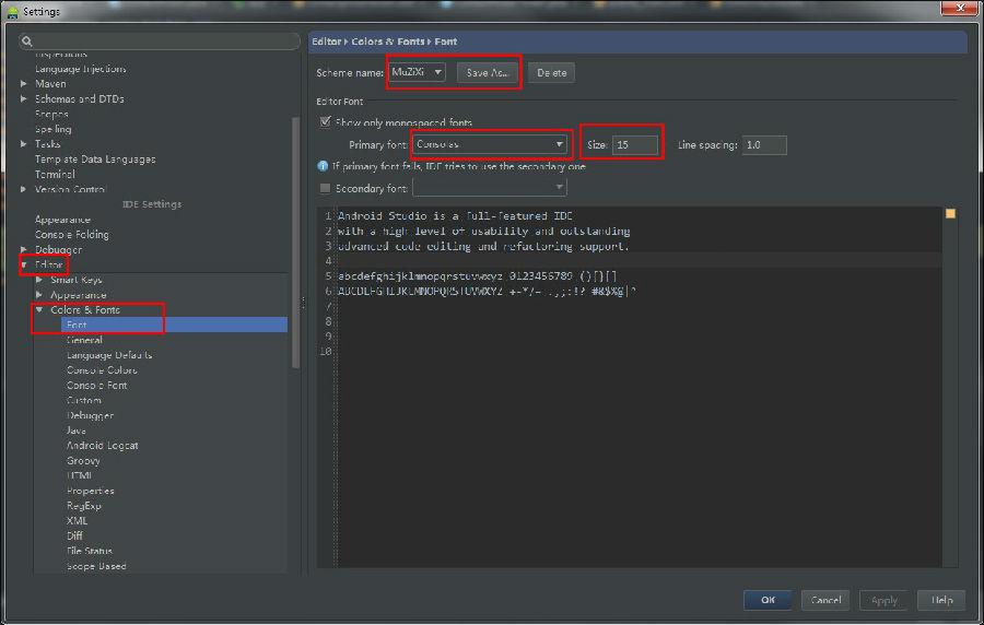 Android Studio 默認編輯器(Editor)的方案(Scheme)是無法修改字體的, 可以Save as, 保存為新的方案(Scheme), 然後更改字體大小;