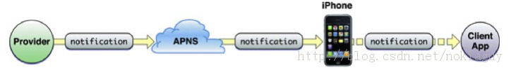 Apple為IOS提供了很完美的推送方案,其基本原理是Apple提供了自己的推送服務器,叫APNS(Apple Push Notification Service,蘋果推送通知服務器)。而客戶端設備(IPhone、IPad等)直接與APNS建立長連接。不過向客戶端設備發送的消息並不是由APNS產生的,而是在需要發送消息的用戶自己提供的服務器(稱為Provider)中產生的,然後Provider將消息傳送給APNS,最後由APNS將消息傳送給客戶端設備。也就是說,消息最開始由Provider產生,然後Provider將消息傳送給APNS,最後再由APNS傳送給客戶端設備。消息傳遞的過程如圖1所示。