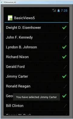 在這種情況下,使用setChoiceMode()方 法去設置ListView回應用戶點擊事件的響應方式。舉個例子,當設置ListView.CHOICE_MODE_MULTIPLE,意味 著用戶可以進行多項選擇: