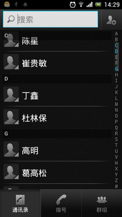 記得在我剛接觸Android的時候對系統聯系人中的特效很感興趣,它會根據手機中聯系人姓氏的首字母進 行分組,並在界面的最頂端始終顯示一個當前的分組。如下圖所示: