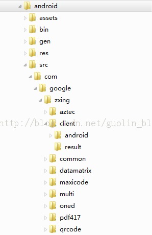 然後 解壓ZXing-2.2這個壓縮包,裡面可以看到各種平台下的ZXing項目源碼,我們進入到android文件夾的src目 錄下,將core-2.2-sources中的源碼拷貝進來。拷貝之後android文件夾下的目錄結構如下圖所示: