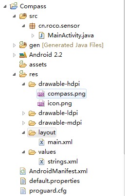 步驟1:新建一個項目Compass,並將一張指南針圖片導入到res/drawable-hdpi目錄中