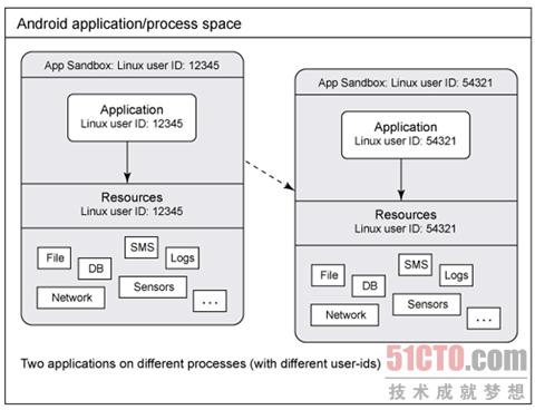 概念上講,沙箱可以表示為 圖 1 所示。可以清楚地看到,兩個 Android 應用程序,各自在其自己的基本沙箱或進程上。