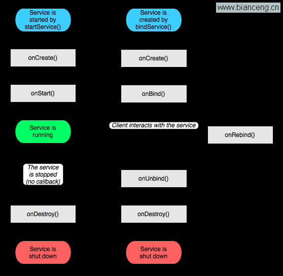 context.bindService() ——> onCreate() ——> onBind() ——> Service running ——> onUnbind() ——> onDestroy() ——> Service stop