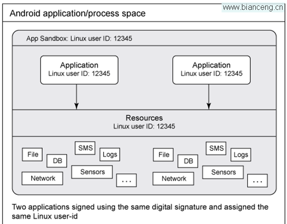 開發者也可以給兩個應用程序分配相同的linux用戶id,這樣他們就能訪問對方所擁有的資源。