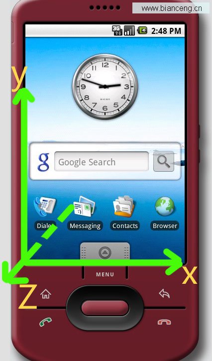 手機屏幕向上(z軸 朝天)水平放置的時侯,(x,y,z)的值分別為(0,0,10);