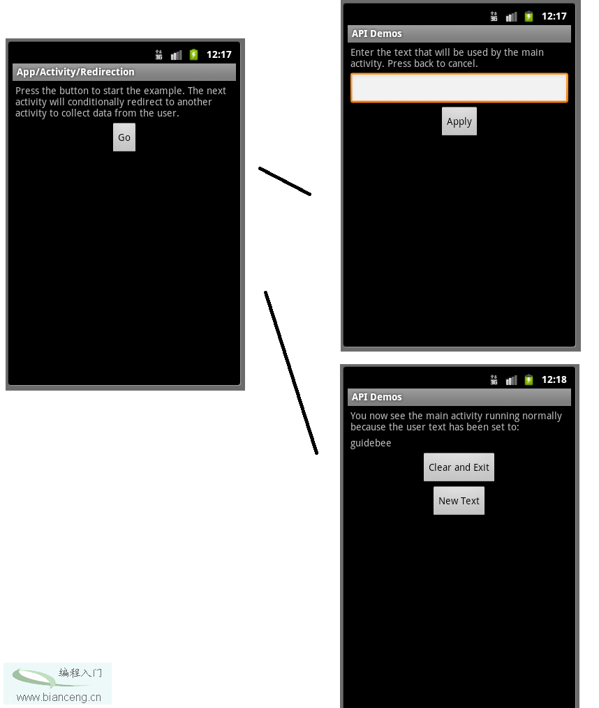 這個例子用戶點擊“Go”按鈕,RedirectEnter 啟動RedirectMain ,RedirectMain 會根據shared preferences是否有值決 定是否redirect 到RedirectGetter, 第一次或是點擊”Clear and Exit”後,shared preferences 中不含有text值,應用會顯 示RedirectGetter 來取的用戶輸入,此時如果用戶輸入並“Apply”後,RedirectGetter將在Shared Preference儲存textView 的值。此後,按“Back” 退回Activity List再啟動RedirectEnter,按“GO”,由於Shared Preferences中有值,RediectMain 不會把應用的控制權Redirect到RedirectGetter.
