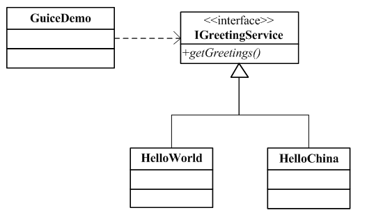假定這個應用使用一個IGreetingService ,它有一個方法getGreeting() 返回一 個字符串,至於IGreetingService 如何實現,GuideDemo 不需要關心。