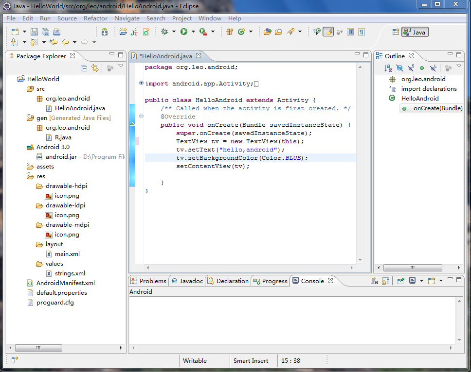 src文件夾保存的是我們編寫的java源文件,我們編寫的源代碼一般都放在這個文件夾內。比如HelloAndroid.java這個文件就是我們編寫的代碼文件。