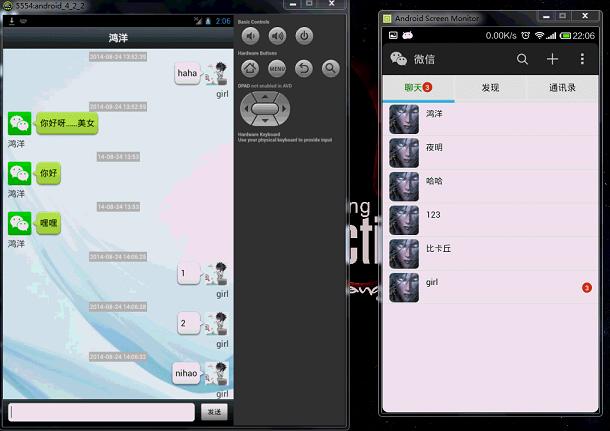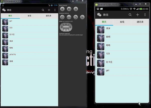 核心功能也就上面的兩張圖了~~~我拿著手機和模擬器聊天,同時感謝群裡的兄弟姐妹幫忙測試(好友列表中)。