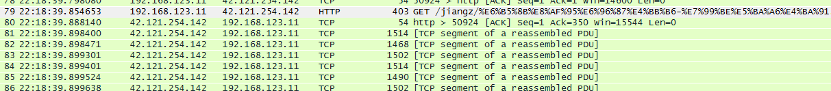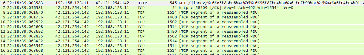 為了驗證如上結論,我在Android 4.4系統中的自帶浏覽器通過訪問並下載這個測試鏈接,並用wireshark進行抓包查看結果。通過如下三張圖,我覺得可以驗證同一份文件確實被傳了兩次。因為兩個不同http get請求之後都可以看到服務器向客戶端發送的連續的TCP數據包。
