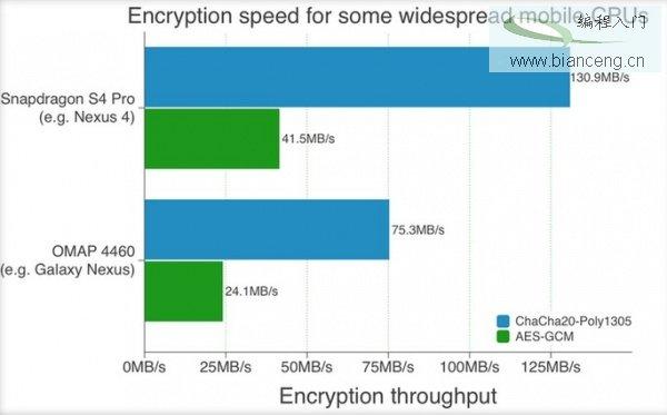 Bursztein解釋稱,ChaCha20-Poly1305的融合算法能夠在采用骁龍S4 Pro芯片的智能手機上以139.9MBPs(兆字節每秒)的速度發出加密數據,比如谷歌的Nexus 4手機上所用的就是S4 Pro芯片;與之相較,AES-GCM算法加密數據的速率僅為41.5MBps。