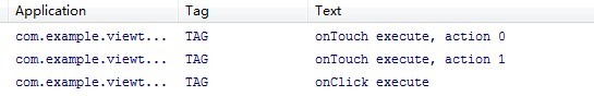 可以看到,onTouch是優先於 onClick執行的,並且onTouch執行了兩次,一次是ACTION_DOWN,一次是ACTION_UP(你還可能會有多次 ACTION_MOVE的執行,如果你手抖了一下)。因此事件傳遞的順序是先經過onTouch,再傳遞到onClick。