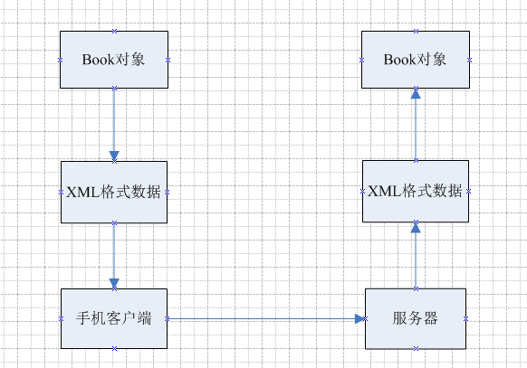 如上圖所示,首先在手機端生成一 個Book對象,裡面包含書名、作者、價格等數據。為了要將這些數據發送到服務器端,我們要從Book對象中 把數據取出,然後組裝成XML格式的字符串。接著通過網絡API,把組裝好的XML字符串發送到服務器端。服務 器端接到了客戶端發來的XML字符串,就要對該XML進行解析。然後把解析出的數據重新組裝成Book對象,之 後服務器端就可以對該對象進行一系列其它的操作了。