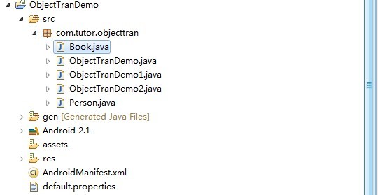 第一步:新建一個Android工程命名為ObjectTranDemo(類比較多哦!)目錄結構如下圖: