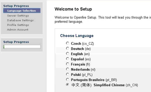 在官網上下載openfire後,解壓,打開bin目錄中的openfire.exe,點擊launch admin,打開openfire管理控制台,第一次進入會出現配置界面,