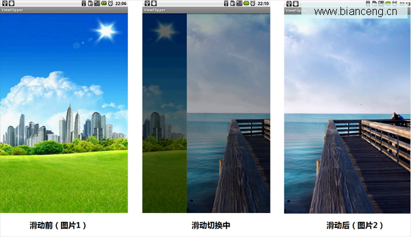本示例 通過ViewFlipper和GestureDetector.OnGestureListener實現自動播放和手勢滑屏事件,先看效果:
