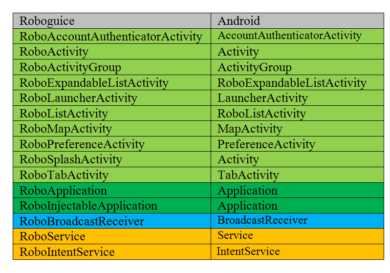 在例Android RoboGuice 使用指南(2):第一個 例子Hello World 介紹了使用RoboGuice開發的步驟,原先從Activity派生的類一 般需要改成從RoboActivity派生,並添加從RoboApplication派生的類作為 Application應用的Application類,詳細的對應表如下: