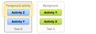 當用戶按下Home鍵離開一個任務,當前的Activity會被停止並且當前任務會進入後台。系統保存該任務中所有Activity的狀態。如果用戶通過啟動圖標再次啟動該任務,該任務會回到前台並且恢復棧頂端的Activity。