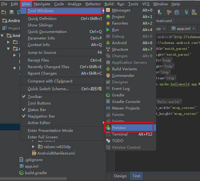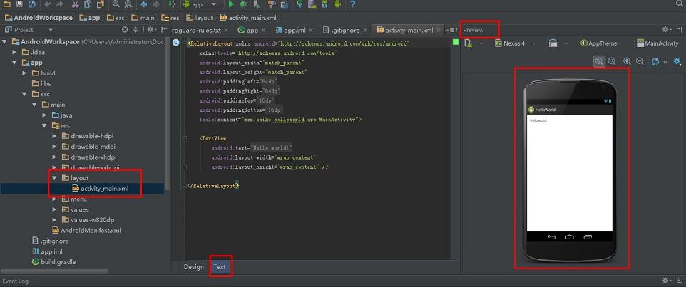 位置: app->src->main->res(資源)->layout(布局), 其中的文件, 包含design和text, 選擇text, 就可以觀察到preview窗口;