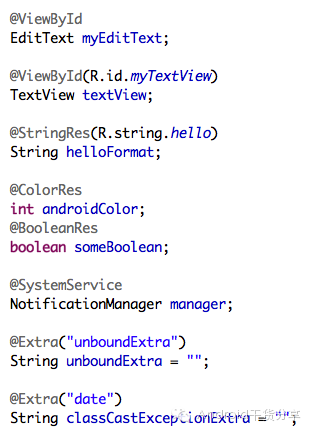 @EActivity這個注解是用來修飾Activity的,向Activity注入布局,也可以設置頁面的樣式為全屏、無Title。這些使用具有實意的注解來實現,是不是很方便呀。對於其他的組件支持也是相當簡單的,如@EService、@EReceiver、@EProvider、@EApplication、@EApplication、@EFragment。同時也能修飾自定義控件,注解為@EView、@EViewGroup。支持是不是相當全面。