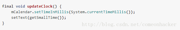在這種情況下,您可能會發現這個layout布局res/layout/status_bar.xml 包含了一個自定義視圖類:com.android.systemui.statusbar.policy.Clock。多個想法可能會現在你的頭腦中。文字顏色的定義是通過textAppearance屬性,所以最簡單的方法就是改變它,將會改變外觀的定義 。然而,這可能有效也可能無效(因為它可能存在於更深的native 代碼中)。更換布局狀態欄將是可能的,但是你們只可以做最小的變化去更改他,相反,看看這個類。有一個叫updateClock方法,它看上去會被每分鐘調用去更新時間