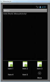 2. 按F11在模擬器上面進行測試。下面展示彈出的選項菜單。選擇一個菜單項或者使用快捷鍵(A 到D)。注意一點,1到3的菜單項並沒有顯示出圖標,盡管我們在代碼中設置了圖標。
