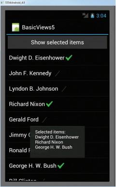 5. 按F11在模擬器上面調試。在ListView中選擇一些物件,然後點擊上面的Button,就會顯示出哪些物件 被選擇了。