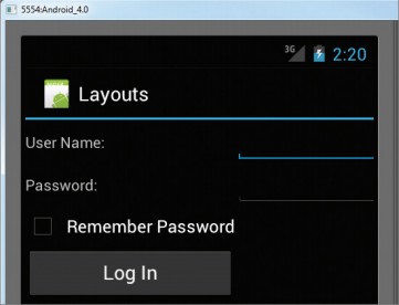 以上的例子,TableLayout中有2列,4行。在“Password” TextView視圖的正下方,是一個空的 <TextView>元素。如果不這麼做的話,“Remember Password” CheckBox就會出現在“Password” TextView視圖的下面,就像這樣:
