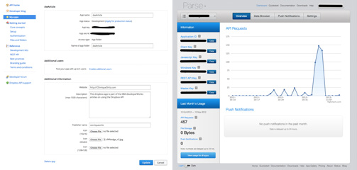 Parse 儀表板可以幫助開發人員管理應用程序。該儀表板為 API、文件和推送的通知提供了一般指標 和應用程序特定的使用指標。通過儀表板可管理應用程序的鍵和設置。該儀表板還提供了數據浏覽器,使開發 人員能夠浏覽(甚至編輯)所存儲的 Parse 對象。數據浏覽器對於調試非常有用。圖 1 是 Parse 儀表板的 屏幕截圖: