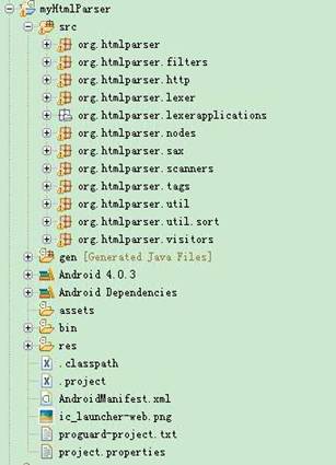 創建 一個 Android 工程,命名為 myHtmlParser。將 HTML Parser 的源代碼導入該工程中,並移除源代碼中的示 例代碼和單元測試代碼;