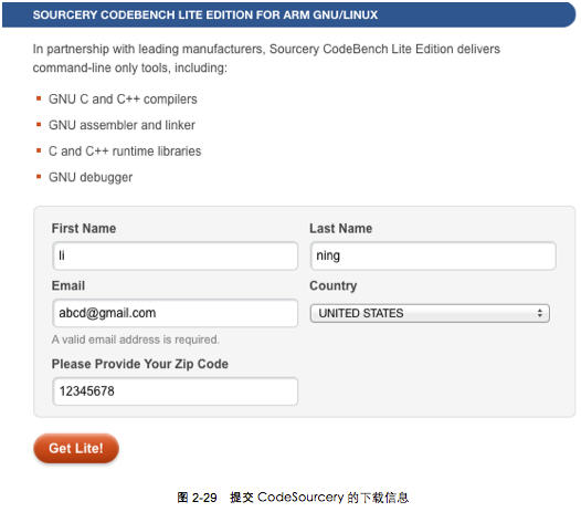 上面的頁面並未直接提供CodeSourcery的下載鏈接,讀者可以點擊“Download the GNU/Linux Release”鏈接,並輸入Email(建議使用Gmail)、地址等信息,最後點擊“Get Lite!”按鈕 提交信息。如圖2-29所示。最後系統會將下載地址發送到剛才輸入的Email。