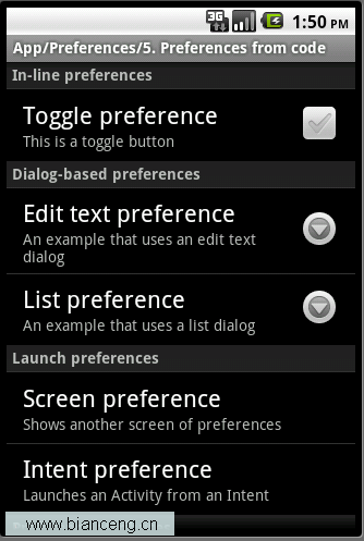 Android ApiDemos示例解析(34):App->Preferences->Preferences from code
